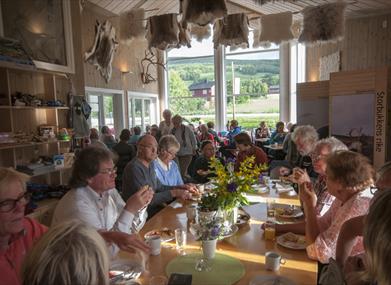 Das Café ist bedient und serviert Speisen mit Fokus auf die Verwendung lokaler Zutaten. Im Sommer werden in der Regel verschiedene Mittagsgerichte sowie an bestimmten Tagen Abendessen mit regionalen Spezialitäten angeboten. Zu den verwendeten Zutaten gehören lokale Käsesorten vom Eggen Gardsysteri, Vingels-Frikadellen und Gebirgsforelle aus der Region. Für vorbestellte Gruppen kann ein eigenes Menü angeboten werden.