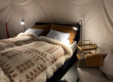 The dome is equipped with a roomy double bed, sitting area, heater, wash basin, kettle for coffee/tea, linens, and towels. The cosy dome atmosphere is equally well-suited for relaxing on intimate wedding nights as well as unwinding after a hunting or fishing trip. A unique experience awaits you here.